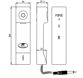 手提式電話分機為:200mm×50mm×38.3mm 固定式電話分機為:206mm×56mm×51.5mm |