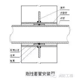 1.剛性套管安裝:主體結構鋼筋綁扎好后,按照給排水施工圖標高幾何尺寸找準位置,然后將套管置于鋼筋中,焊接在鋼筋網中,如果需氣割鋼筋安裝的,安裝后必須用加強筋加固,并做好套管的防堵工作。剛性套管安裝如圖所示: