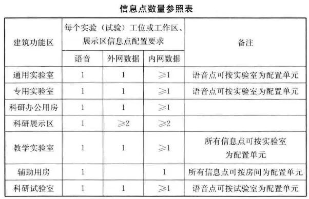 (3)在通用實驗室、專用實驗室、科研辦公用房、科研展示區(qū)、教學實驗室及輔助用房、科研試驗室內(nèi)應(yīng)設(shè)置語音、數(shù)據(jù)信息點。信息點數(shù)量宜符合下表的規(guī)定。