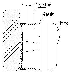 B-9310模塊后備盒與各類模塊的接線管路明裝時配合使用,可先根據(jù)工程現(xiàn)場情況,選擇后備盒底的一組合適的安裝孔,將后備盒安裝到墻壁上;再在后備盒側(cè)壁的適當位置根據(jù)穿線管尺寸打進線孔(也可在后備盒未安裝前打孔),將線接入后備盒后安裝模塊。安裝圖如圖: