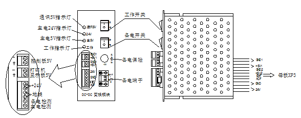 注意:當DC-DC變換模塊的開關關閉時,總線控制24V并未關斷,如需插拔主機箱內的線路板,請務必先關閉主、備電電源。