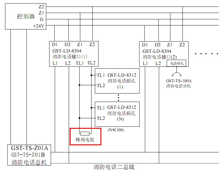 海灣GST-LD-8312消防電話插孔端子XT1電話線輸入端,端子XT2電話線輸出端,接下一個電話插孔,最末端電話插孔XT2接線端子接4.7kΩ終端電阻。