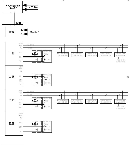 +24V、GND:各區的輔助電源輸出端子,為現場的系統設備如聲光警報器、氣體噴灑指示燈和輸出模塊供電。