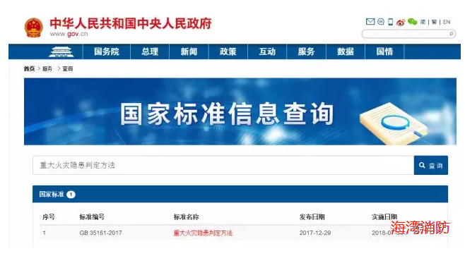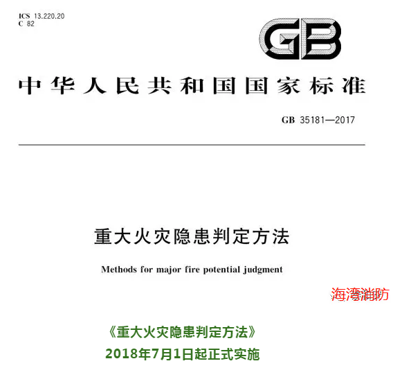 2017 年12 月29 日, 國家標準委批準發布強制性國家標準《重大火災隱患判定方法》(GB35181-2017), 自2018 年7 月1 日起正式實施。