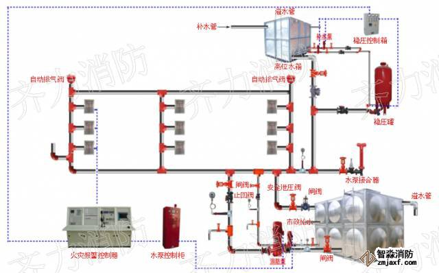 自動噴水滅火系統分為濕式、干式和預作用式等類型。目前,大部分高層建筑使用的為濕式系統,即平時在管道中充有一定壓力的水,當保護對象發生火災時,噴頭周圍溫度升高,達到一定溫度時,含金片熔化,噴頭碎裂,水從噴口向四周均勻噴灑,進行滅火。其組成是由報警閥、延遲器、水力警鈴、管網、噴頭。