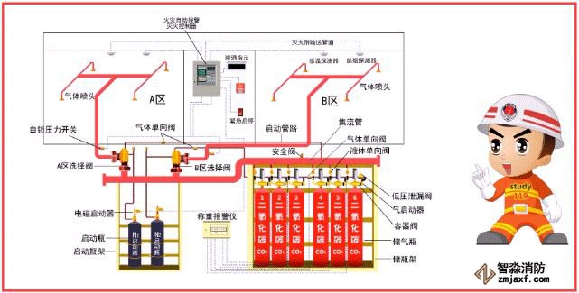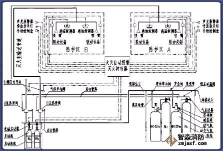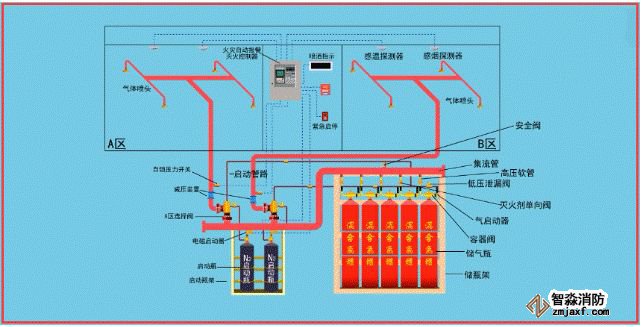 該系統(tǒng)由滅火劑瓶組、加壓氣體瓶組、驅(qū)動(dòng)氣體瓶組(可選)、單向閥、選擇閥、減壓裝置、驅(qū)動(dòng)裝置、集流管、連接管、噴頭、信號(hào)反饋裝置、安全泄放裝置、控制盤(pán)、檢漏裝置、管道管件及吊鉤支架等組成。