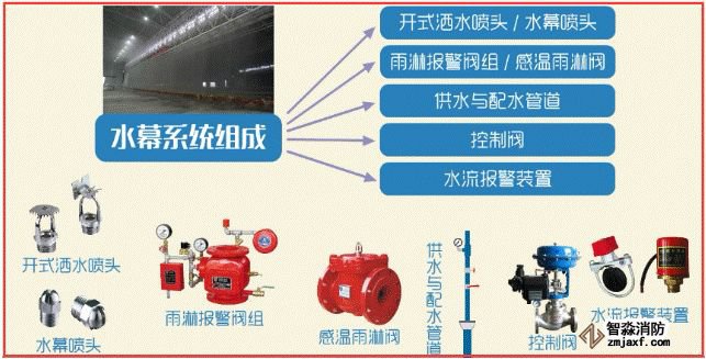 水幕系統(tǒng)由開(kāi)式灑水噴頭或水幕噴頭、雨淋報(bào)警閥組或感溫雨淋閥、供水與配水管道、控制閥以及水流報(bào)警裝置(水流指示器或壓力開(kāi)關(guān))等組成。