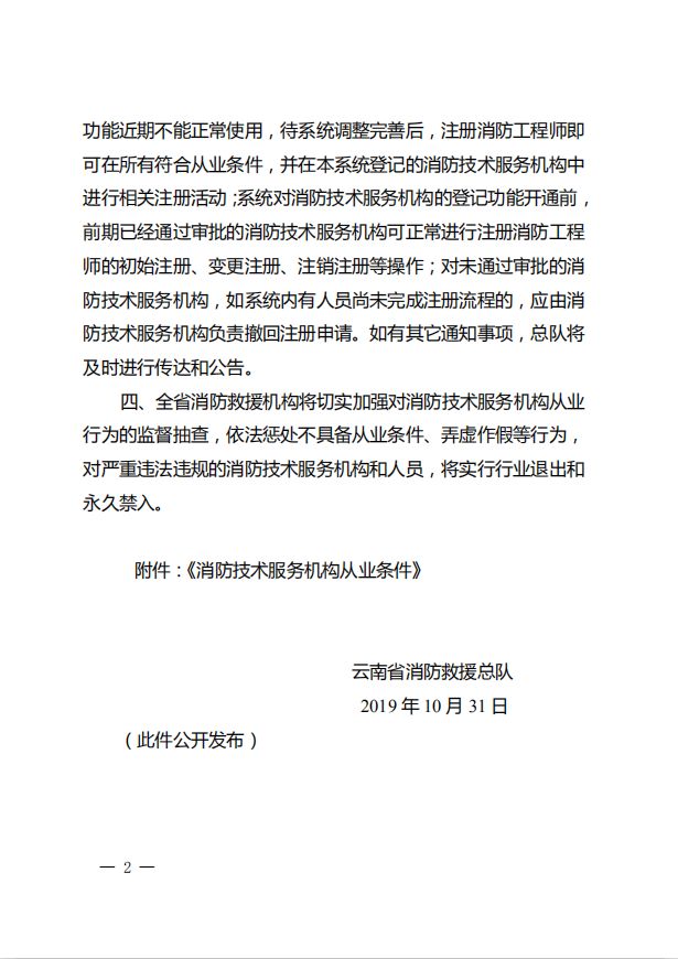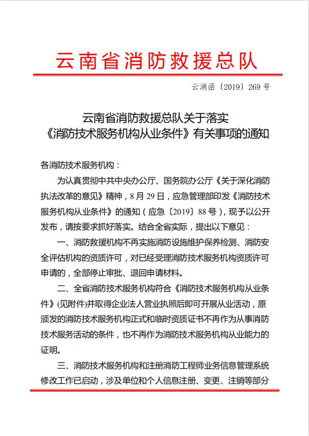 一、消防救援機構不再實施消防設施維護保養檢測、消防安全評估機構的資質許可,對已經受理消防技術服務機構資質許可申請的,全部停止審批、退回申請材料。