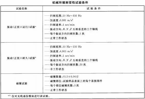 系統應能耐受下表所規定的機械條件下的各項試驗。試驗期間,系統應無機械損傷和緊固部位松動現象;試驗后,系統應保持正常無線通信狀態。