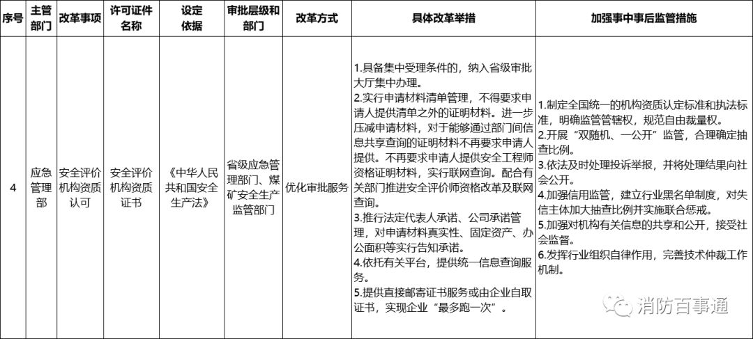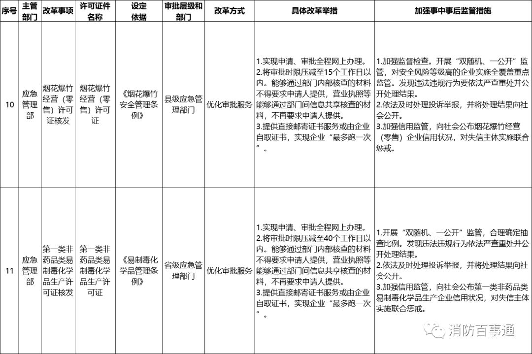 《通知》涉及的應急管理部門、消防救援機構行政許可改革事項共16項。其中,消防技術服務機構資質審批事項改革方式為“直接取消審批”;公眾聚集場所投入使用、營業(yè)前消防安全檢查事項改革方式為“實行告知承諾”;其他14項改革方式為“優(yōu)化審批服務”。