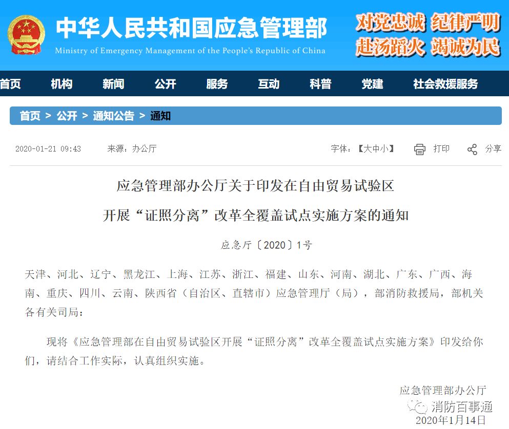 近日,應急管理部發(fā)布應急廳〔2020〕1號文件,認真貫徹落實《國務院關于在自由貿(mào)易試驗區(qū)開展“證照分離”改革全覆蓋試點的通知》(國發(fā)〔2019〕25號,以下簡稱《通知》)精神,扎實做好涉及應急管理部門有關行政許可事項改革工作。