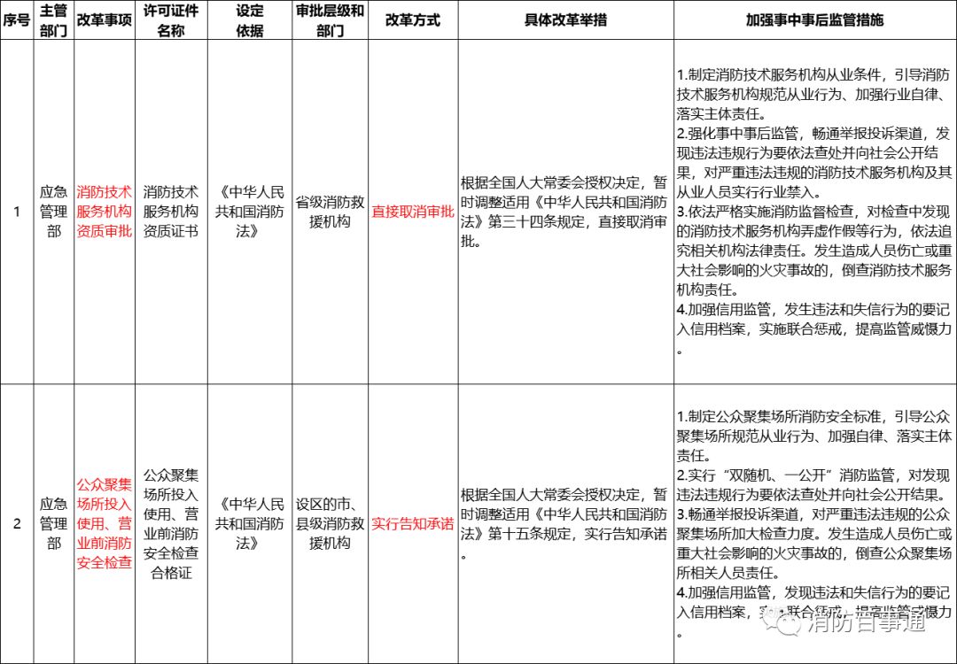 對消防技術服務機構資質審批事項和公眾聚集場所投入使用、營業(yè)前消防安全檢查事項,消防救援局和有關省級消防救援機構按照《清單》的規(guī)定,取消消防技術服務機構資質許可,公眾聚集場所投入使用、營業(yè)前消防安全檢查實行告知承諾管理。