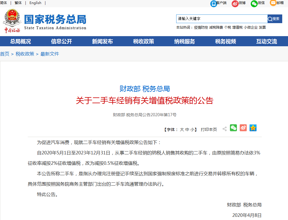 根據財政部、稅務總局關于二手車經銷有關增值稅政策的公告(財政部 稅務總局公告2020年第17號),自2020年5月1日至2023年12月31日,從事二手車經銷的納稅人銷售其收購的二手車,由原按照簡易辦法依3%征收率減按2%征收增值稅,改為減按0.5%征收增值稅。