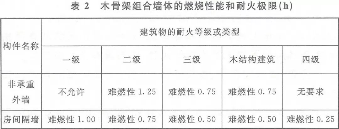 (3)木骨架組合墻體的燃燒性能和耐火極限應(yīng)符合下表2的規(guī)定,其他要求應(yīng)符合現(xiàn)行國家標(biāo)準(zhǔn)《木骨架組合墻體技術(shù)規(guī)范》GB/T 50361的規(guī)定。