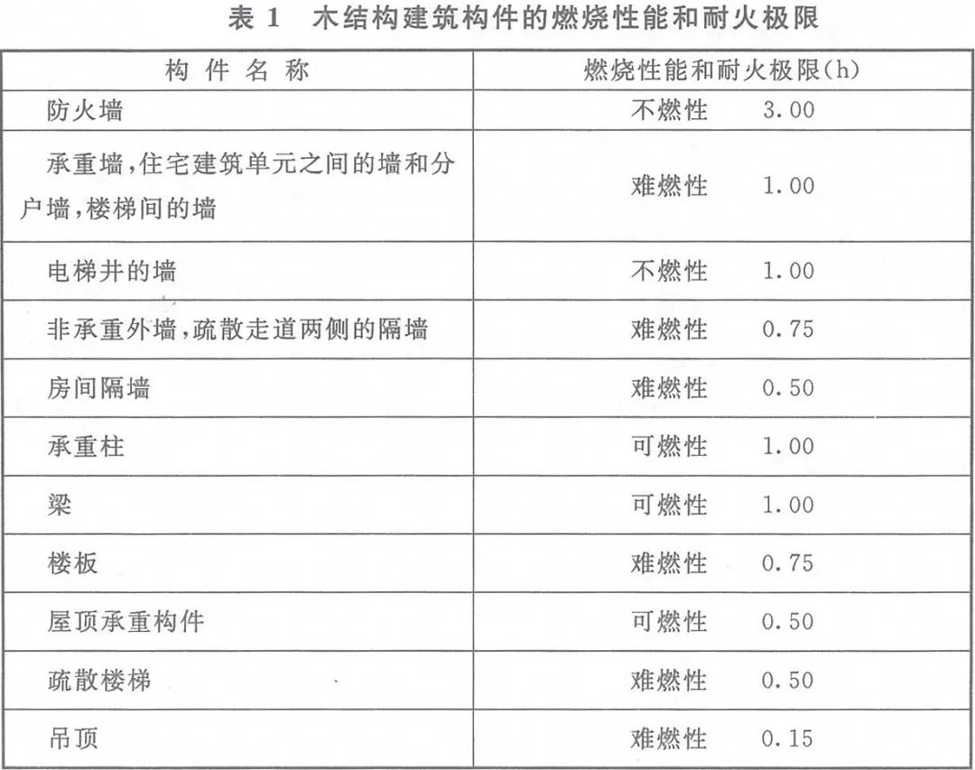 1、木結(jié)構(gòu)建筑的防火設(shè)計可按本文的規(guī)定執(zhí)行。建筑構(gòu)件的燃燒性能和耐火極限應(yīng)符合下表1的規(guī)定。