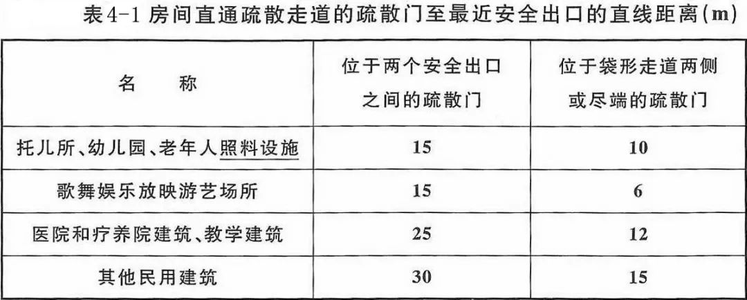 (2)房間直通疏散走道的疏散門至最近安全出口的直線距離不應(yīng)大于下表4-1的規(guī)定;