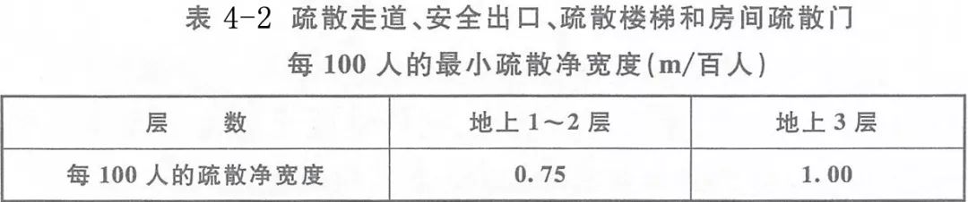 (4)建筑內(nèi)疏散走道、安全出口、疏散樓梯和房間疏散門的凈寬度,應(yīng)根據(jù)疏散人數(shù)按每100人的最小疏散凈寬度不小于下表4-2的規(guī)定計算確定;