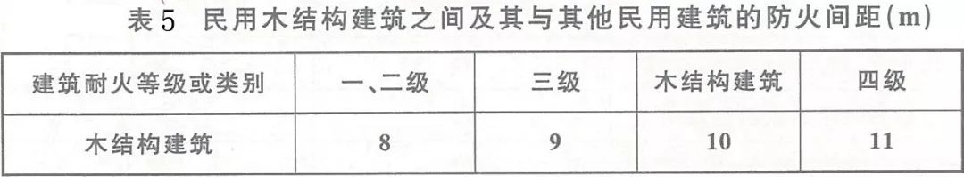 10、民用木結(jié)構(gòu)建筑之間及其與其他民用建筑的防火間距不應(yīng)小于下表5的規(guī)定。