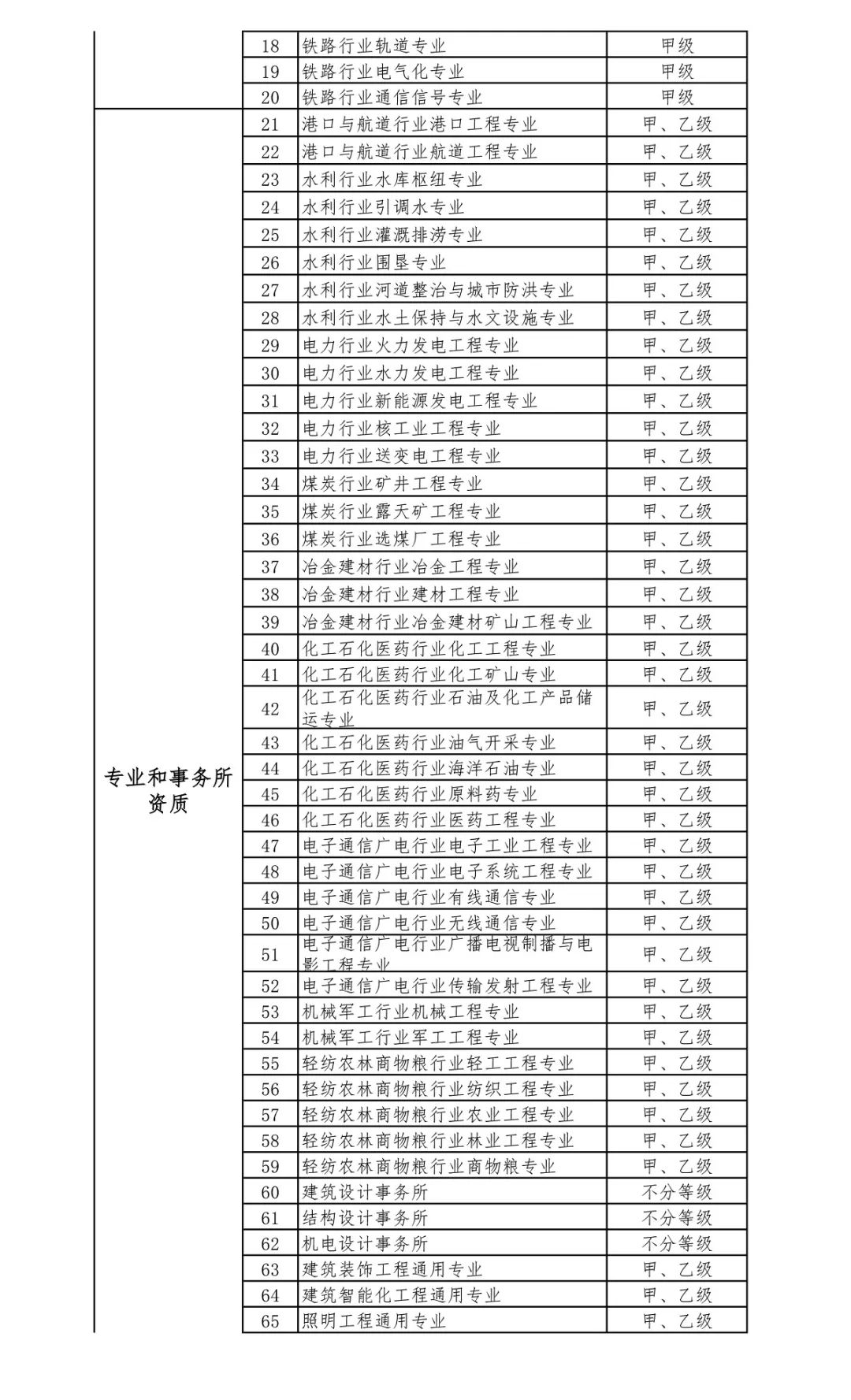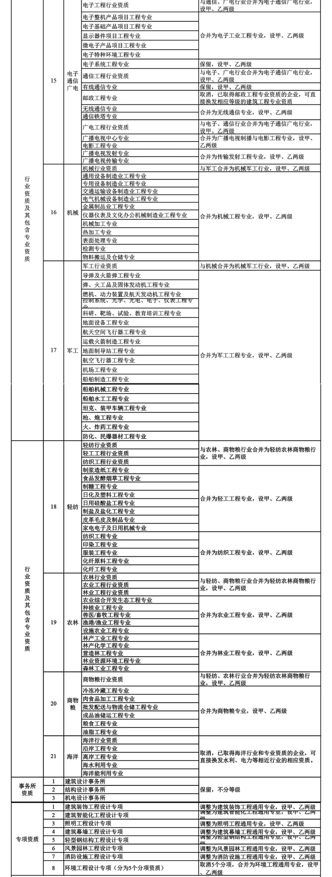 2.工程設計資質。保留綜合資質;將21類行業資質整合為14類行業資質;將151類專業資質、8類專項資質、3類事務所資質整合為70類專業和事務所資質。綜合資質、事務所資質不分等級;行業資質、專業資質等級原則上壓減為甲、乙兩級(部分資質只設甲級)。
