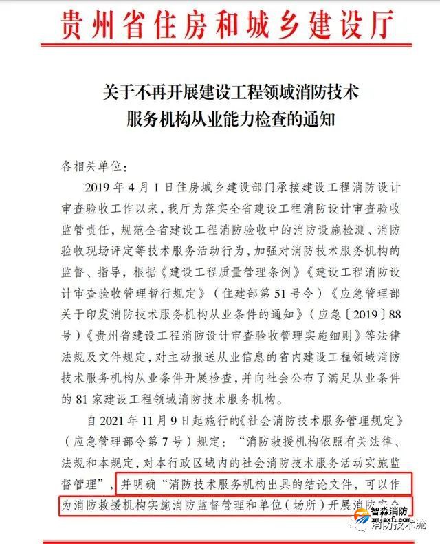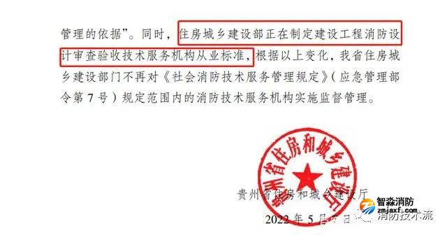 近日,貴州省住建廳發(fā)布通知,不再開展建設工程領域消防技術服務機構從業(yè)能力檢查,不再對《社會消防技術服務管理規(guī)定》(應急管理部令第7號)規(guī)定范圍內(nèi)的消防技術服務機構實施監(jiān)督管理,并透露,住房城鄉(xiāng)建設部正在制定建設工程消防設計審查驗收技術服務機構從業(yè)標準