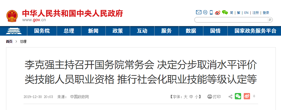 會議指出,按照黨中央、國務院部署,深化“放管服”改革,將技能人員水平評價由政府認定改為實行社會化等級認定,接受市場和社會認可與檢驗。這是推動政府職能轉變、形成以市場為導向的技能人才培養使用機制的一場革命,有利于破除對技能人才成長和弘揚工匠精神的制約,促進產業升級和高質量發展。會議確定,從2020年1月起,除與公共安全、人身健康等密切相關的消防員、安檢員等7個工種依法調整為準入類職業資格外,用一年時間分步有序將其他水平評價類技能人員職業資格全部退出國家職業資格目錄,不再由政府或其授權的單位認定發證;同時,推行職業技能等級制度,制定發布國家職業標準或評價規范,由相關社會組織或用人單位按標準依規范開展職業技能等級評價、頒發證書。已發放的水平評價類技能人員職業資格證書繼續有效。會議要求穩妥推進現有職業資格實施機構職能調整,做好工作銜接。加強涉及評價質量、收費等的事中事后監管。