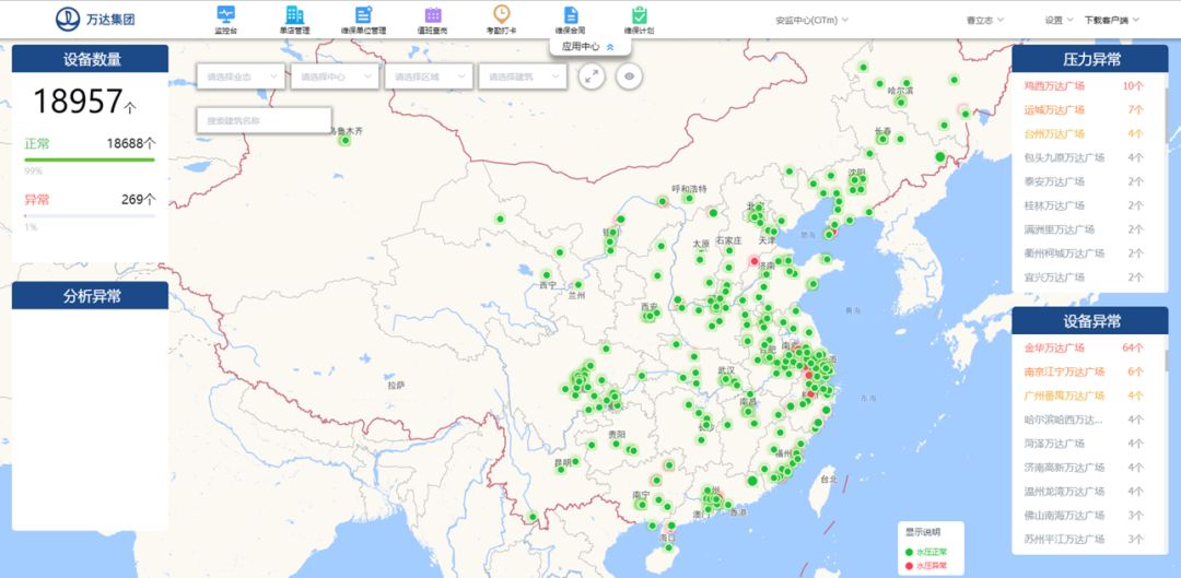 首先是巨大的中國地圖,萬達(dá)管理的全國所有廣場、酒店、樂園等在營業(yè)的物業(yè)一覽無余,綠色的點(diǎn)代表一切運(yùn)轉(zhuǎn)正常,如果出現(xiàn)紅色則代表著某個環(huán)節(jié)出現(xiàn)了隱患,激活了報警。