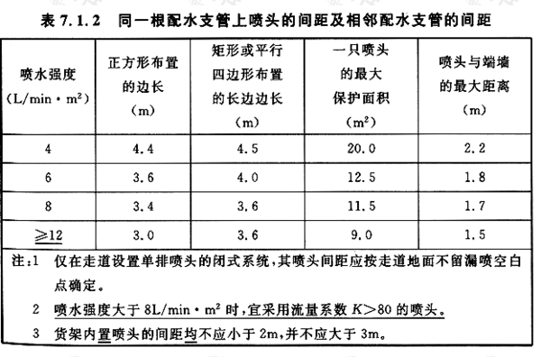 7.1.2直立型、下垂型噴頭的布置,包括同一根配水支管上噴頭的間距及相鄰配水支管的間距,應根據系統的噴水強度、噴頭的流量系數和工作壓力確定,并不應大于表7.1.2的規定,且不宜小于2.4m。