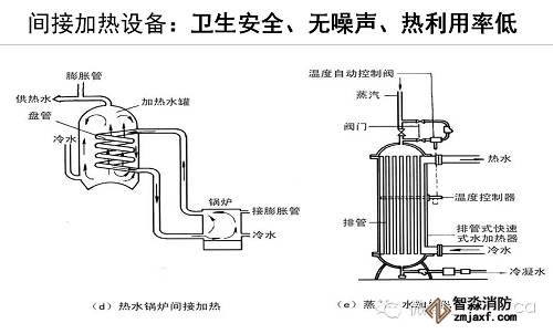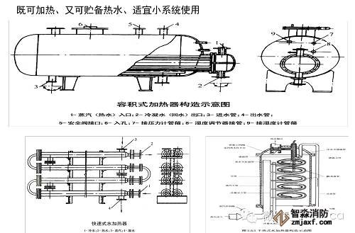 間接加熱設(shè)備:容積式水加熱器、快速式水加熱器、半即熱式水加熱器 、分段式水加熱器。