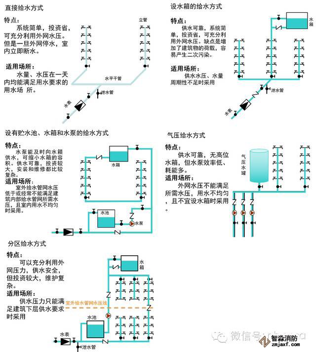 適用條件:設(shè)水池、水泵的給水方式適用于所需的建筑。