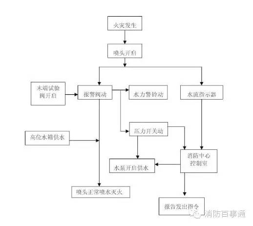 當自動噴淋滅火系統的保護區域內發生火情時,火場環境溫度升高,閉式噴頭上的玻璃球破裂(或易熔合金熔化),噴頭打開噴水滅火。此時由于濕式報警閥出口側管網水壓下降,形成壓差,閥瓣組件打開,供水側水源水不斷補充管網滅火,同時水流也經密封環槽內的孔流入延遲器,并迅速充滿,以一定水壓沖擊水力警鈴發出連續的報警聲,壓力開關動作接通電觸點,并將信號反饋至控制中心,以聲、光報警,同時啟動主供水泵進行消防滅火。