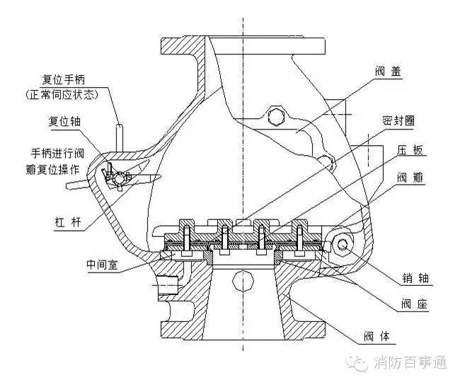 該干式報警閥屬于差動式干式報警閥。閥內的閥瓣組件包括氣密封閥座和水密封閥座,氣密封閥座的直徑大于水密封閥座的直徑,處于伺應狀態時,閥瓣蓋在兩個閥座上。兩閥座之間的中間室通過報警管路與大氣相通。閥瓣上方須注入少量的預注水以增加閥瓣的密封性,在閥門系統側通入一定壓力值的壓縮空氣。如系統側噴頭打開時造成壓縮空氣壓力下降,當氣壓降至約為供水壓力值五分之一時,干式閥打開。壓力水流向系統側管路,從打開的噴頭處噴水滅火。同時水經干式閥中間室流向報警口驅動壓力開關動作和水力警鈴報警。