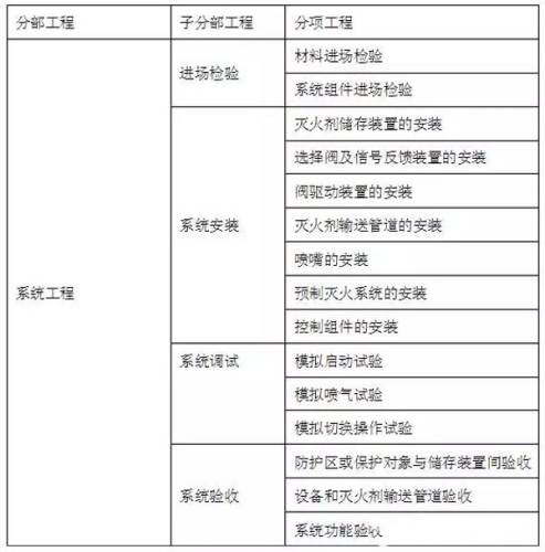 氣體滅火系統的分部工程、了分部工程、分項工程劃分可按下本規范表執行