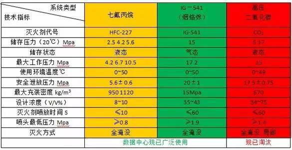 下文將針對(duì)數(shù)據(jù)中心機(jī)房中氣體滅火系統(tǒng)的選擇,講述七氟丙烷與IG541煙洛盡系統(tǒng)的對(duì)比。二氧化碳滅火系統(tǒng)會(huì)使人窒息,且在滅火過程中產(chǎn)生的殘留物對(duì)設(shè)備造成污染,現(xiàn)已很少出現(xiàn),本文只做簡(jiǎn)單介紹。