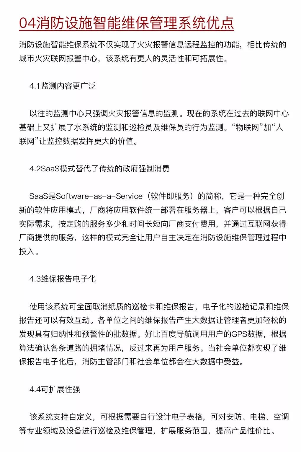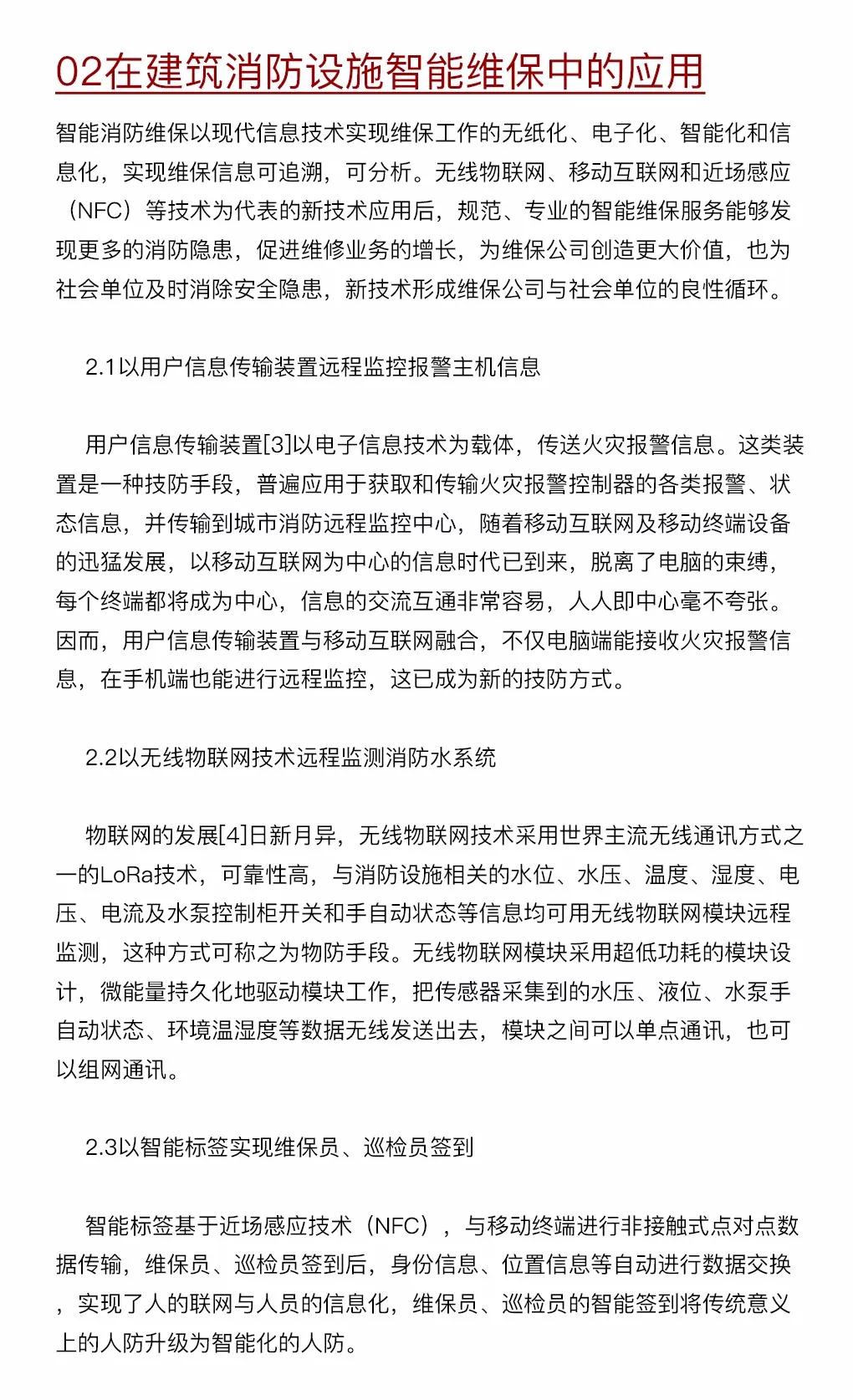 建筑消防設施智能維保管理系統采用無線物聯網、互聯網、近場感應等技術,節省了大量的施工布線成本,改變了傳統消防設施維護保養方式,滿足了社會單位、維保公司和消防主管部門的消防設施管理檢查的需求,符合消防事業的規劃與發展潮流,是社會單位消防安全管理向消防信息化、智能化轉變的模式創新。
