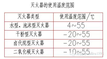 在非必要配置鹵代烷滅火器的場所,不得選用鹵代烷滅火器,宜選用磷酸銨鹽干粉或其他類型滅火器。滅火劑不相容的滅火器不能在同一場合應(yīng)用,滅火器的適用溫度應(yīng)符合環(huán)境溫度的要求。